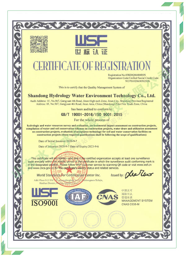 公司擁有水利工程設(shè)計(jì)、水土保持、水文水資源調(diào)查評(píng)價(jià)、水資源論證、建設(shè)項(xiàng)目環(huán)境影響評(píng)價(jià)、市政公用工程施工總承包、水利水電工程施工總承包、電子與智能化工程專業(yè)承包等資質(zhì),2017年通過質(zhì)量管理體系、環(huán)境管理體系、職業(yè)健康安全管理體系認(rèn)證;2020年被評(píng)為國家級(jí)高新技術(shù)企業(yè),同年被中國水利企業(yè)協(xié)會(huì)推薦為第一批“合同節(jié)水服務(wù)企業(yè)”;2021年被山東省、濟(jì)南市評(píng)為 “專精特新”中小企業(yè)。業(yè)務(wù)范圍涉及水利工程設(shè)計(jì);節(jié)水設(shè)計(jì)、改造、水平衡測(cè)試;山洪災(zāi)害調(diào)查;城市水資源調(diào)查評(píng)價(jià);建設(shè)項(xiàng)目水土保持方案編制、監(jiān)測(cè)、驗(yàn)收、水土保持規(guī)劃;水安全保障規(guī)劃、建設(shè)項(xiàng)目水資源論證、規(guī)劃水資源論證;建設(shè)項(xiàng)目環(huán)境影響評(píng)價(jià);入河排污口論證;防洪影響評(píng)價(jià);市政公用工程施工、水利水電工程施工、電子與智能化工程施工等。
